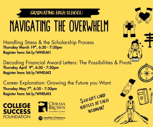 Join College Success Foundation and Odessa Brown Children’s Clinic for Part 1 of Navigating the Overwhelm! In this session, learn about how to manage the stress of finding, organizing, and applying for scholarships to help with college funding. Ideal for high school families and college students! Register here.